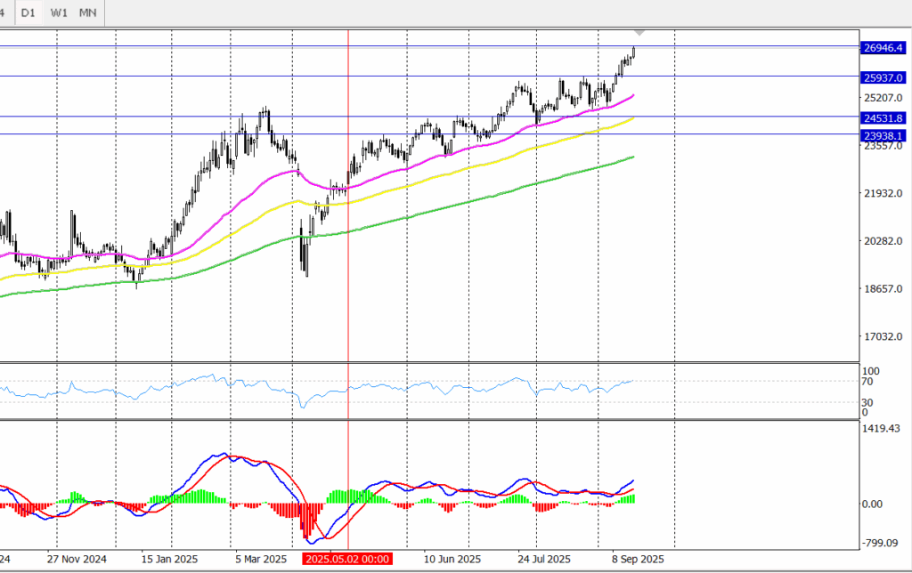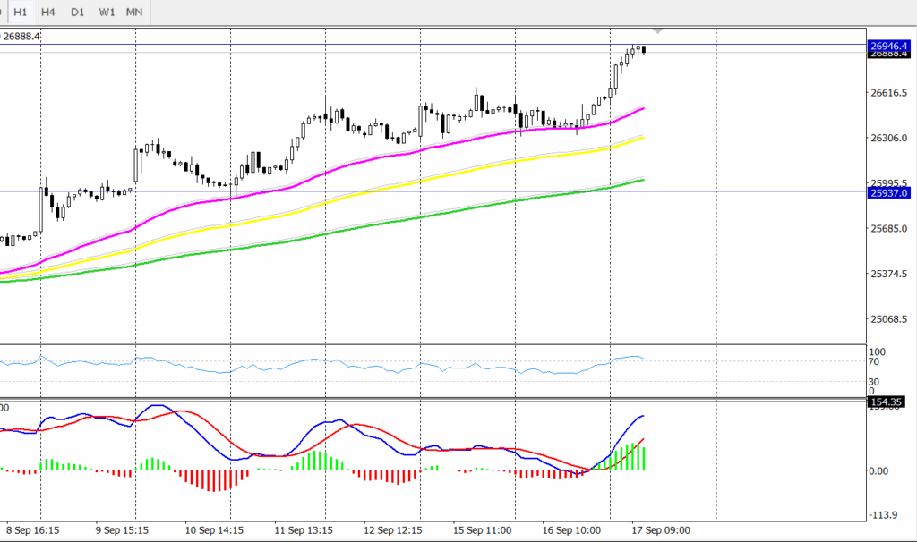 Today’s high is acting as a strong resistance. A clear day close above the 26946 level could pave the way toward 28238, which is the high of July 15, 2021. This level has never been tested since that time.