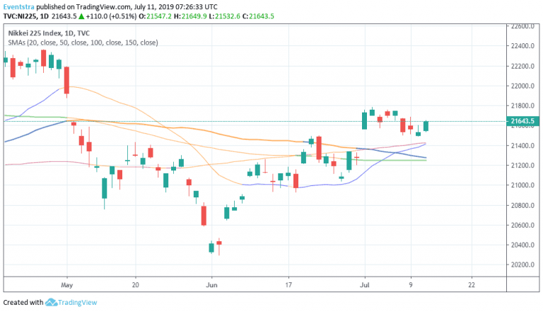 Asian stocks finished higher as investors increase bets of rate cut in July after Jerome Powell’s testimony yesterday. The Hang Seng finished 0.75 percent higher at 28,417, the Shanghai composite slipped 0.09 percent to 2,917 and the Singapore Straits Times index finished 0.63 percent higher at 3,362. Aussie stocks also managed to finish higher, the ASX200 ended 0.4 percent higher at 6,716. The Australia Consumer Inflation Expectations came in to 3.2% in July from previous 3.3%. Australia Home Loans came in at 0% above forecasts of -0.6% in May. In Japan the main benchmark, Nikkei 225 finished 0.51 percent higher at 21,643, the Tertiary Industry Index (month over month) came in at -0.2% below expectations of -0.1% in June.