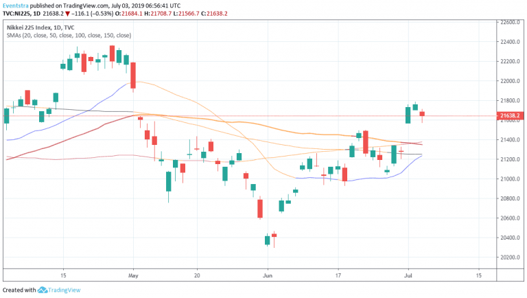 Asian indices finished lower today as traders digest the results of the much anticipated G20 in Osaka, Japan. The Hang Seng gives up 0.34 percent lower at 28,773, the Shanghai composite slipped 0.90 percent to 3,016 and the Singapore Straits Times index finished 0.32 percent lower at 3,359. ASX 200 in Australia is 0.3 percent higher at 6672.3 after RBA cut interest rates for a second straight month to a record low 1 percent. In Japan the main benchmark, Nikkei 225 finished 0.53 percent lower at 21,638 amid threats from US of new tariffs on European imports. Earlier today the China’s Caixin services PMI for June came in at 52.0 worst than analyst’s expectations of 53.0, the previous figure was 52.7, the Composite Output Index dropped to 50.6 in June from 51.5 that was in May’s.