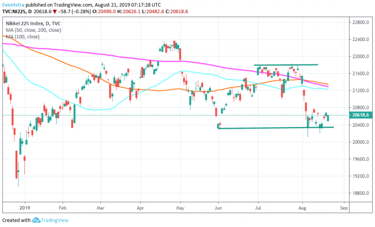 Nikkei 225 consolidates the recent rebound from seven month lows after tested the support at 20,300 the lows from early June. A break below that level might accelerate the selloff below the 20,000 mark. On the upside resistance for the Nikkei 225 stands at 20,930 the high from August 5th and then at 21,238 the 50 day moving average.