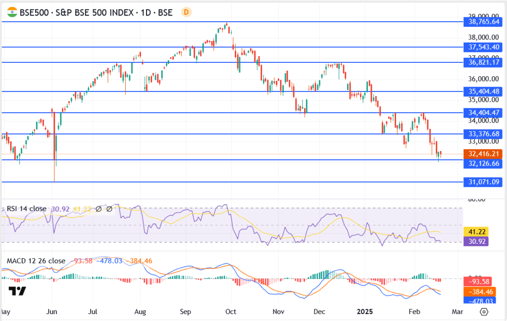 The BSE 500 Index is currently trading at 32,416.21, attempting to stabilize after a sharp decline. The index has fallen for several consecutive sessions, testing the critical support zone at 32,126.66. If this level holds, a rebound could push the index toward 33,376.68, while a breakdown may lead to deeper losses, targeting 31,071.09.