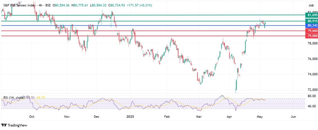 The Sensex Index pivots at 80,342 points and the upside will prevail if action stays above that level. The momentum will likely meet initial resistance at 80,915. However, an extended control by the buyers will break above that level and test 80,695 points.