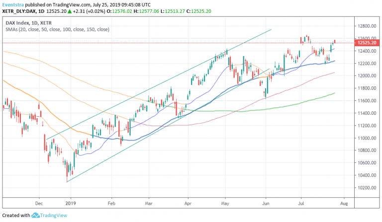 European indices started higher today as investor’s attention turns to ECB decision later. As of writing the DAX Index is 0.05 percent lower at 12,516 giving up all the morning gains. Earlier today a big disappointment came from the Germany IFO Business Climate which came in at 95.7 below expectations of 97.1 in July, the IFO Current Assessment came in at 99.4 also below expectations of 100.4 in July. The IFO – Expectations came in at 92.2, below expectations of 94 in July. The worse macro news support a dovish tone from ECB as poor economic data may push the European Central Bank to proceed with further stimulus to support the EU economy.