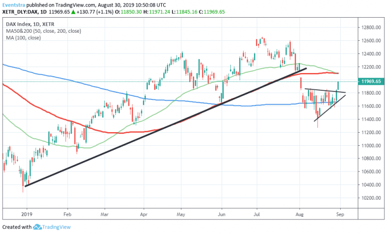 - DAX breaks today above the recent triangle formation giving the bulls a hope for higher levels. Immediate support for the DAX index stands at 11,845 today’s