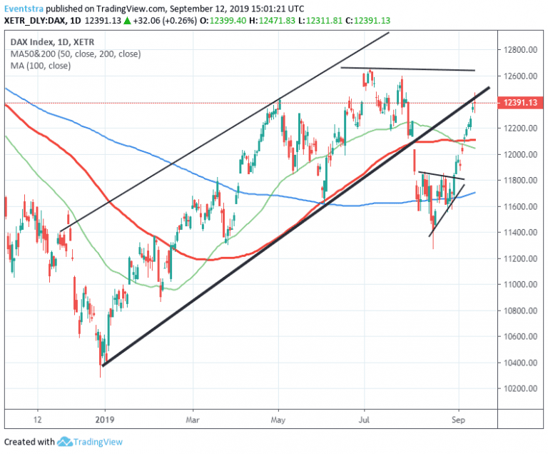 DAX index is 0.39% higher at 12,406 after ECB cut its deposit interest rate at -0.50%, and launched a new round of monthly bond purchases. Investors concerns on US-China trade tensions eased after President Trump announced a 2-week delay in tariff hikes in $250 billion in Chinese imports.