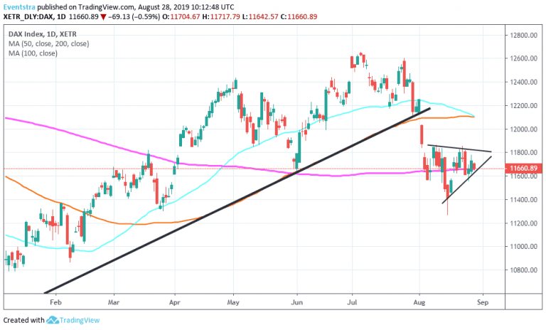 - DAX consolidates after recent correction and has formed a triangle that signals the price will continue for lower levels. The index today testing the 11,659