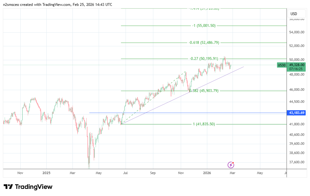 The 20 June 2025 – 13 November 2025 upswing on the Dow produced several potential Fibonacci extension levels. The 27% Fibonacci extension at 50195 aligned with the close to the subsequent record high on 10 February. The ascending trendline that connects the lows remains intact, supporting the Dow’s uptrend.