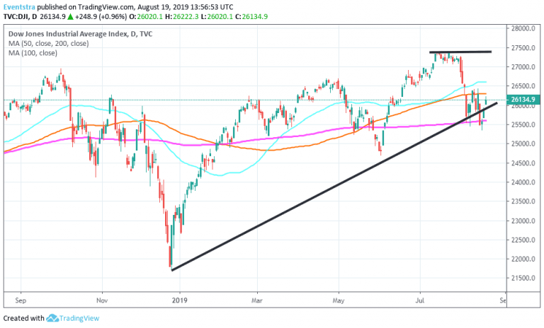 - Dow Jones holds the 200 day moving average and today returned inside the ascending trendline after jumping more than 280 points regaining