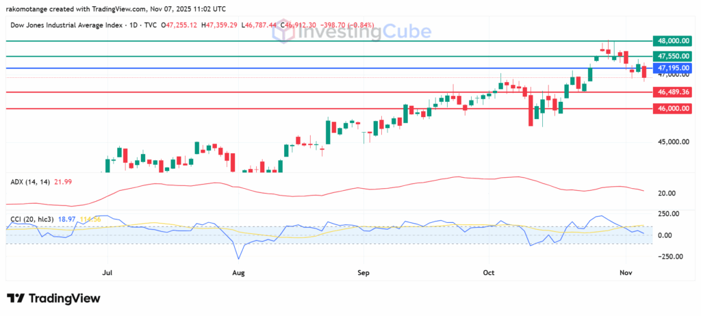 The Dow’s chart suggests a slight downward trend for now. The price has dropped below 47,195 pivot and will likely find its support at 46,000–46,489. Resistance is seen at the pivot mark, with the next two in the 47,550–48,000. Momentum shows waning bullishness: ADX at 21.11 indicates weakening trend strength, supported by CCI at 18 which flags building bearish pressure.