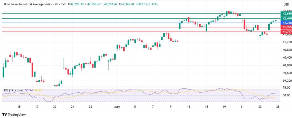 On the other hand, the momentum will likely shift to the downside if the Index breaks below 42,180. That will likely see the first support established at 42,110 points. The upside narrative will be invalid if the index breaks below that level. Also, an extended control by the sellers will send the action lower and potentially test 41,820.