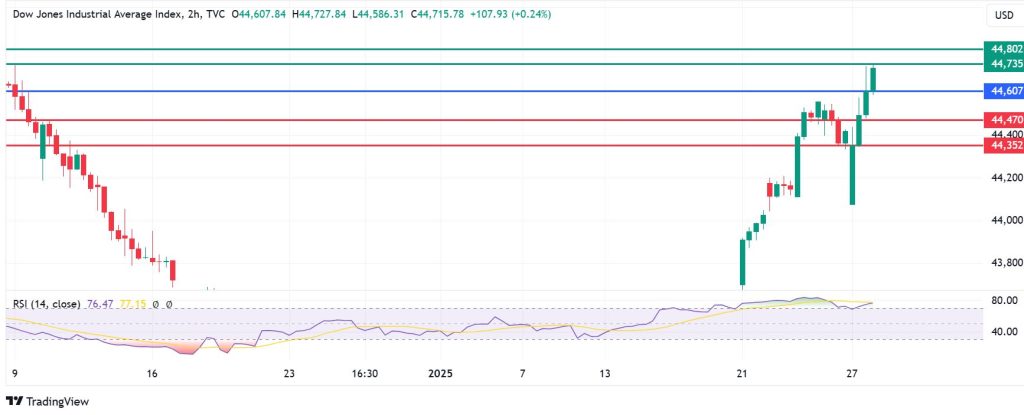 The momentum on the Dow Jones Index favours the upside if action stays above 44,607 points. Immediate resistance is likely to be at 44,735 points. However, a stronger momentum will break above that level and potentially test the second barrier at 45,802.