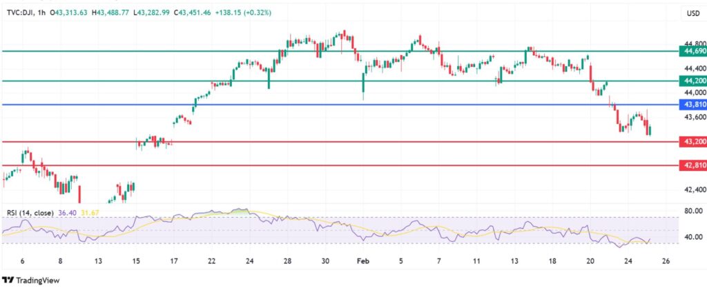 The Dow Jones Index continued to struggle near five-week lows on Tuesday on mounting pressure created by renewed global trade tariff concerns. The Index was down by 0.2% at the time of writing, with its level 43,363 points, a day after US President Donald Trump announced that tariffs against Canada and Mexico would go forward after the elapse of an initial 30-day pause.