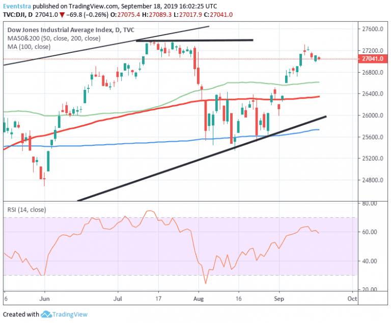 Wall Street indices started lower today with the Dow Jones giving up 0.32% at 27,023.05. The Nasdaq currently is trading 0.37% lower at 8,155, while the S&P 500 trading 0.31% lower at 2,996.71. United States Housing Starts Change came in at 12.3%, above forecasts of 4.5% in August, Building Permits Change fell from previous 8.4% to 7.7% in August. The CBOE Volatility Index or fear index is adding 4.92% at 15.15 just to confirm the nervous market mood ahead of the Fed decision in about two hours.