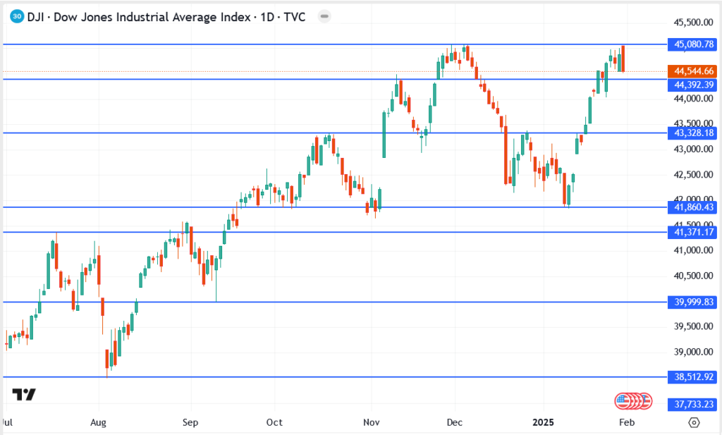The Dow Jones Industrial Average (DJI) is facing selling pressure near its recent highs as traders react to former President Donald Trump’s proposed tariff plans. The index, which recently surged past 44,500, is now struggling to break through the 45,080 resistance level, with investors weighing potential trade disruptions.