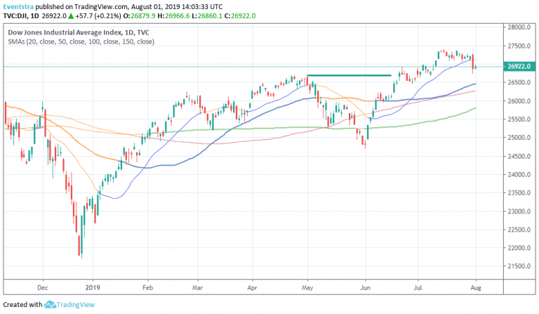 Wall Street indices started higher today with the Dow Jones adding 0.27% at 26,944.12. The S&P 500 adds 0.33% at 2,991, while the Nasdaq is 0.69% at 8,231 after the Fed cut the interest rates yesterday by 25 bp while earlier the Initial Jobless claims came in better than forecasts. The July ISM manufacturing index came in at 51.2 missing expectations of 52.0.