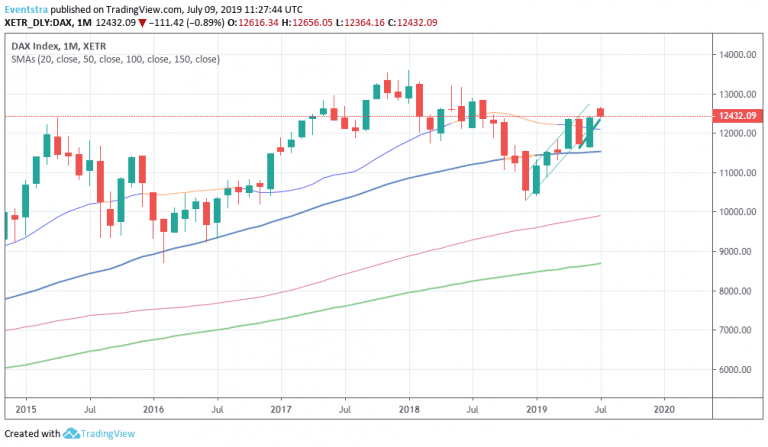 As of writing the DAX 30 is 0.92 percent lower at 12,427 the CAC 40 in Paris is 0.30 percent lower at 5,572, in London the FTSE 100 is 0.02 percent lower at 7,548. Earlier today a Bloomberg survey shows that the UK economy is forecast to have contracted in second quarter of 2019. That will be the first contraction in Great Britain economy since 2012. The projections are now for a 0.1% contraction, a downgrade from earlier prediction of stagnation, 0.0% in June. Earlier today the British Retail Consortium data for June came in worst than expected, down 1.6%, year over year for sales like-for-like. It was expected at -1.1%, year over year, while the previous reading was -3.0%.