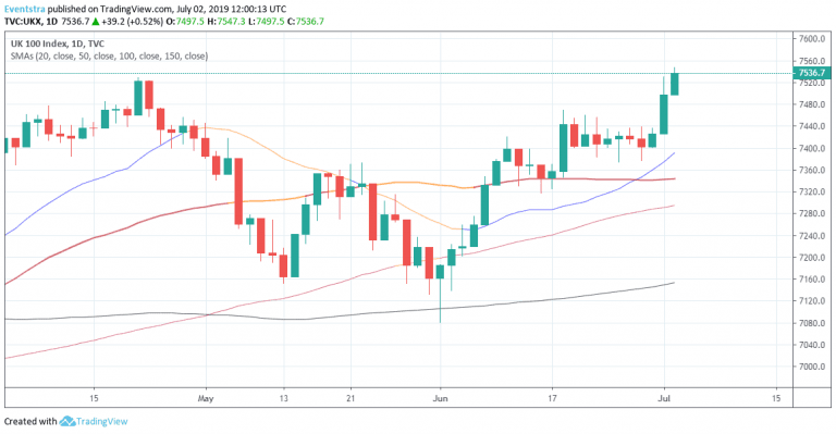 European equities trading flat as the initial optimism after China – US trade truce that agreed in Osaka, Japan evaporates. As of writing the DAX 30 is 0.05 percent lower at 12,514 the CAC 40 in Paris is adding 0.03 percent at 5,569, in London the FTSE 100 outperforms as it is 0.55 percent higher at 7,538 despite the UK Markit Construction PMI came in at 43.1 worst than analyst’s expectations of 49.2 for June. Earlier data from Germany showed that the Retail Sales shrunk, month over month, at -0.6 percent, worst than analyst’s forecasts of 0.5 percent in May, the year over year figure came in at 4%, beating forecasts of 2.7 percent in May. In the EU leader’s summit they still can’t decide about the top positions in ECB, Commision, the European Council and the European Parliament. Investors in the old continent also turn their eyes and twitter accounts on President Trump as US is mulling tariffs against imports from EU amid the airplane industry dispute. The Office of Trade proposed a list of additional products for tariff countermeasures that covers an estimated $4B, including, cheese, whiskeys and wines.