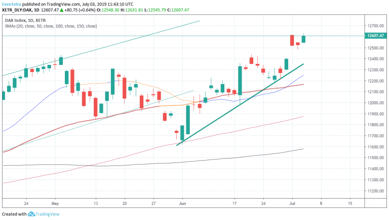 European equities trading higher today after Christine Lagarde International Monetary Fund managing director elected to be the next head of the European Central Bank (ECB). As of writing the DAX 30 is 0.65 percent higher at 12,611 the CAC 40 in Paris is adding 0.68 percent at 5,614, in London the FTSE 100 outperforms as it is 0.77 percent higher at 7,614 despite BOE Policy Committee member Cunliffe noted that the risk of a no deal Brexit has gone up. Earlier today German Markit Services PMI came in at 55.8, beating analysts’ expectations of 55.6 for the same month. In France Markit Services PMI came in at 52.9, worst than market consensus of 53.1 for June, while the Markit PMI Composite came in at 52.7, again below analysts’ estimates of 52.9 in June. EU Markit PMI Composite came at 52.2 beating forecasts of 52.1 for June, while the Services PMI came at 53.6 also beating analyst’s forecasts above expectations of 53.4 for the same month. The Italy Services PMI came at 50.5 better than economists’ forecast of 50 in June.