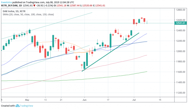 European equities started the week lower after mixed data from Germany and France. Earlier today the German industrial production output rose 0.3% m/m in May, easing investors worries of a slowdown in Europe’s largest economy. On an annualized basis, the German industrial production came in at -3.7% versus -1.1% expected and -1.8% booked in April. Germany May trade balance came in at €20.6 billion above analysts’ forecasts of €17.0 billion. Germany Imports, Month over Month, came in at -0.5%, missing forecasts of -0.2% in May. Germany Exports, Month over Month, came in at 1.1%, beating analysts’ expectations of 0% in May. The EU Sentix Investor Confidence released at -5.8, below economists’ forecasts of 0.1 for July. The figure is a result of all the dismal data reported the previous weeks from EU zone. The -5.8 is the worst level since November 2014.
