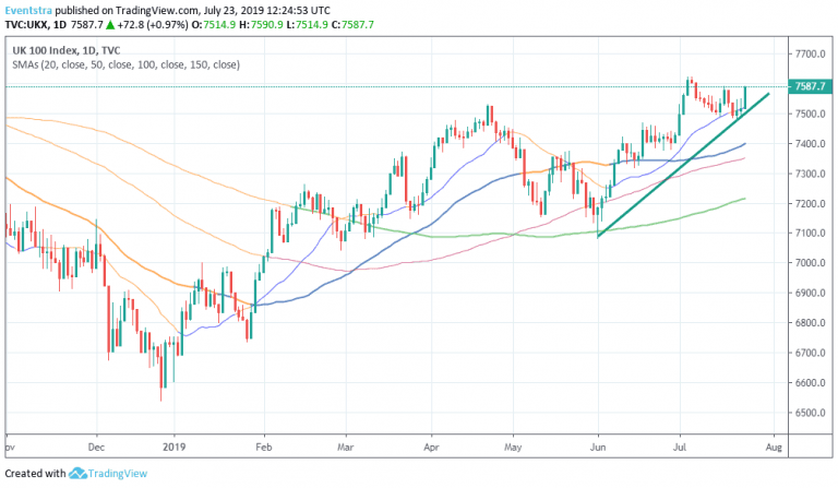 FTSE 100 trades 0.65 percent higher at 7,563 as Boris Johnson announced as Britain’s next prime minister. Stock markets have totally discounted the Johnson election and now focus on the Brexit strategy. FTSE 100 is getting a boost by a weaker pound, GBPUSD is trading close to three years low at 1.2460 versus USD.