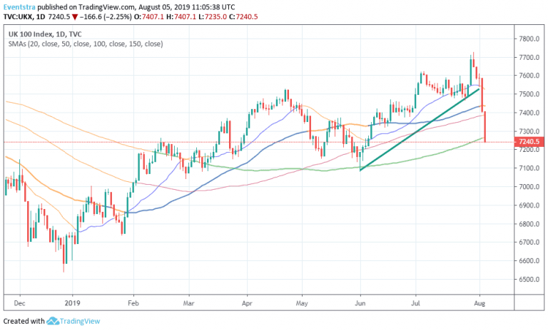 - FTSE 100 underperforms its European peers for one more day giving up 2.05 percent at 7,255 mirroring Asian Indices, amid US-China trade war escalation