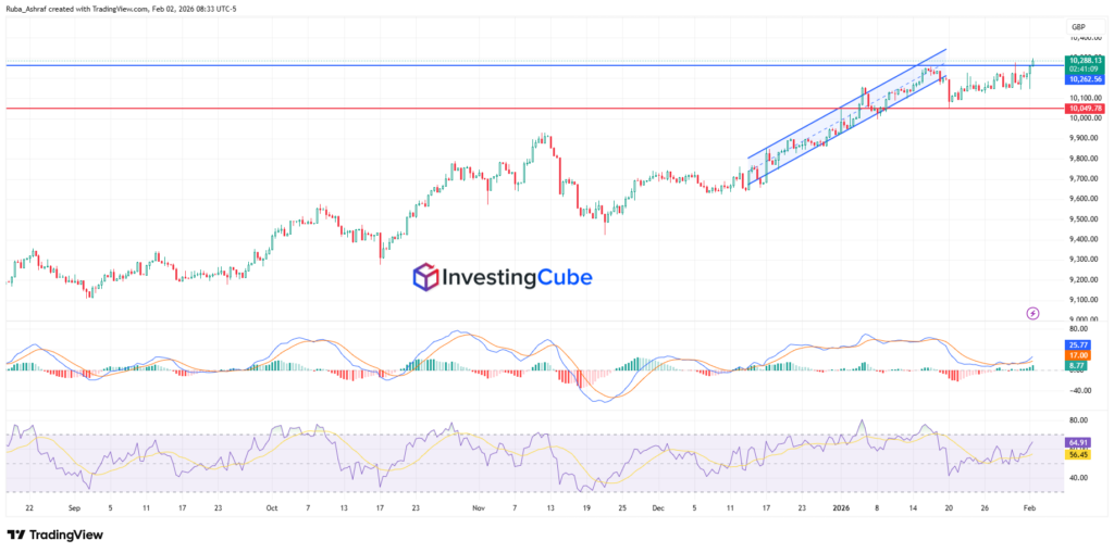 What we are showing here for the FTSE 100 is the opposite scenario compared to last week’s analysis of the same index. Six days ago, the FTSE 100 edged higher as the surge in gold prices surpassed $ 5,000 per ounce. This, in turn, lifted the index higher. The move was driven by its heavy exposure to global mining and commodity companies.