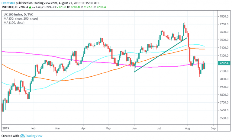 FTSE 100 is trading 1.15% higher at 7,207 making for third session an attempt to close above the 200 day moving average. Earlier the United Kingdom Public Sector Net Borrowing came in at £-1.971B, topping expectations of £-2.65B in July. GBPUSD is under pressure today giving up 0.34% at 1.2127. Wall Street and Asian indices ended lower as investors await the Fed Minutes later today.