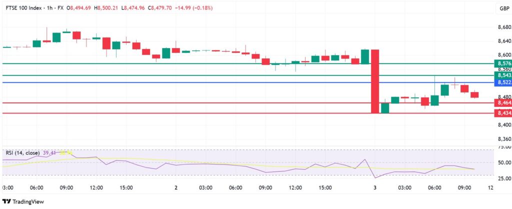 On the flip side, moving above 8,522 points will shift the momentum to the upside. That will likely see the first resistance encountered at 8,543. The downside narrative will be invalid if the price breaches that mark. Also, an extended control by the sellers could send the FTSE Index higher and test 8,576.