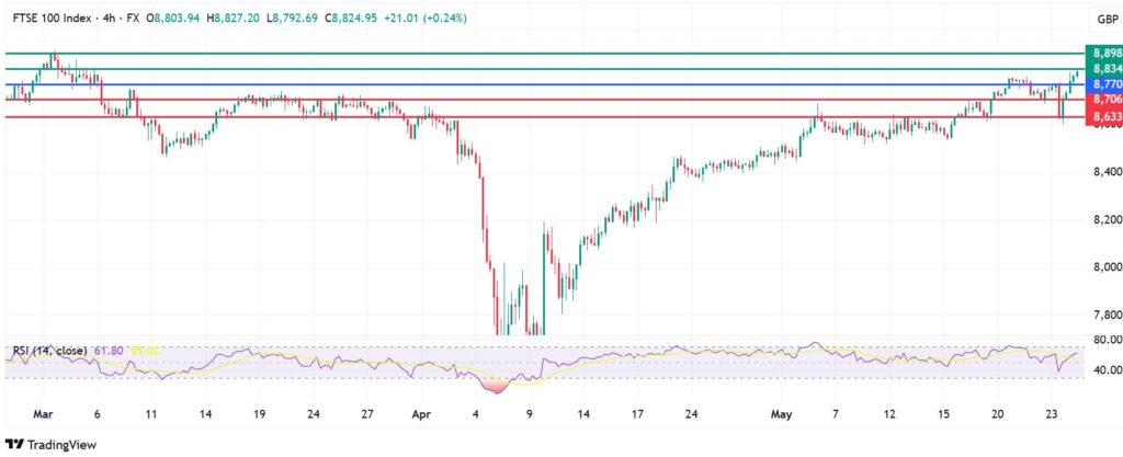 Investors are also encouraged by recent economic data that showed the UK’s economy grew by 0.7% in the first quarter, exceeding the forecast estimate figure of 0.1%. In addition, Retail Sales grew by 1.2% in April, beating economists’ forecast figure of 0.2%. Also, the Bank of England is expected to continue with its monetary policy easing in the second half of the year. However, it will be careful to diffuse the inflationary pressure that drove the CPI to 3.5% last month.