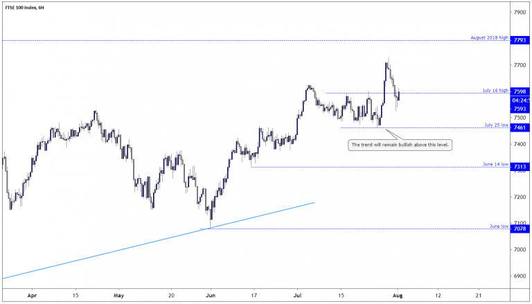 Today, the FTSE 100 index is up as it bounces from support. On Monday, I said that the FTSE 100 trend had turned bullish and would remain bullish above the July 25 low of 7461. I also said that traders would probably buy the FTSE 100 on a dip to the July 16 high of 7593. The stock index has since then slid to the high and undershot it, but not enough to trigger a trend reversal. Today, it looks like the price will leave the 7461-7593 interval and resume its uptrend, but price action should remain choppy with the Bank of England meeting on deck. I don’t anticipate the BoE to introduce any new measures or changes to their policies with Brexit looming, but if they make any change, I think they will be dovish to not deviate enough from the ECB and the Federal Reserve. If they are indeed dovish, it should support the FTSE 100.