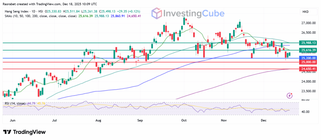 Hang Seng Index daily chart on December 18, 2025. Key support and resistance levels created on TradingView