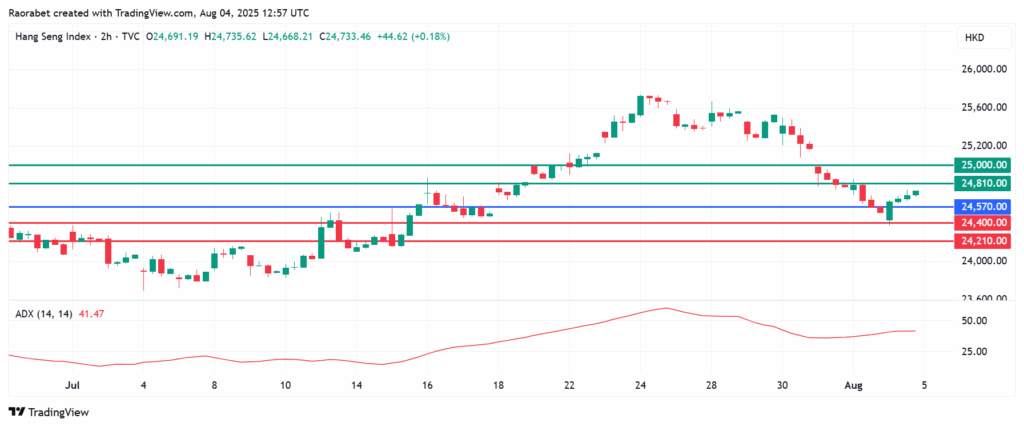 Hang Seng Index pivots at 24,570 points and action above that level will favour the upside to prevail. The first resistance will likely be at 24,810 points. However, an extended control by the buyers will break above that level and could send the Index higher to test 25,000.