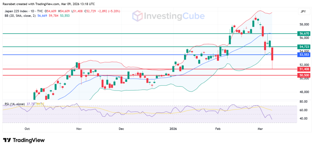 Nikkei 225 Index on March 9, 2026, showing the key levels of resistance and support on the daily chart. Created on TradingView