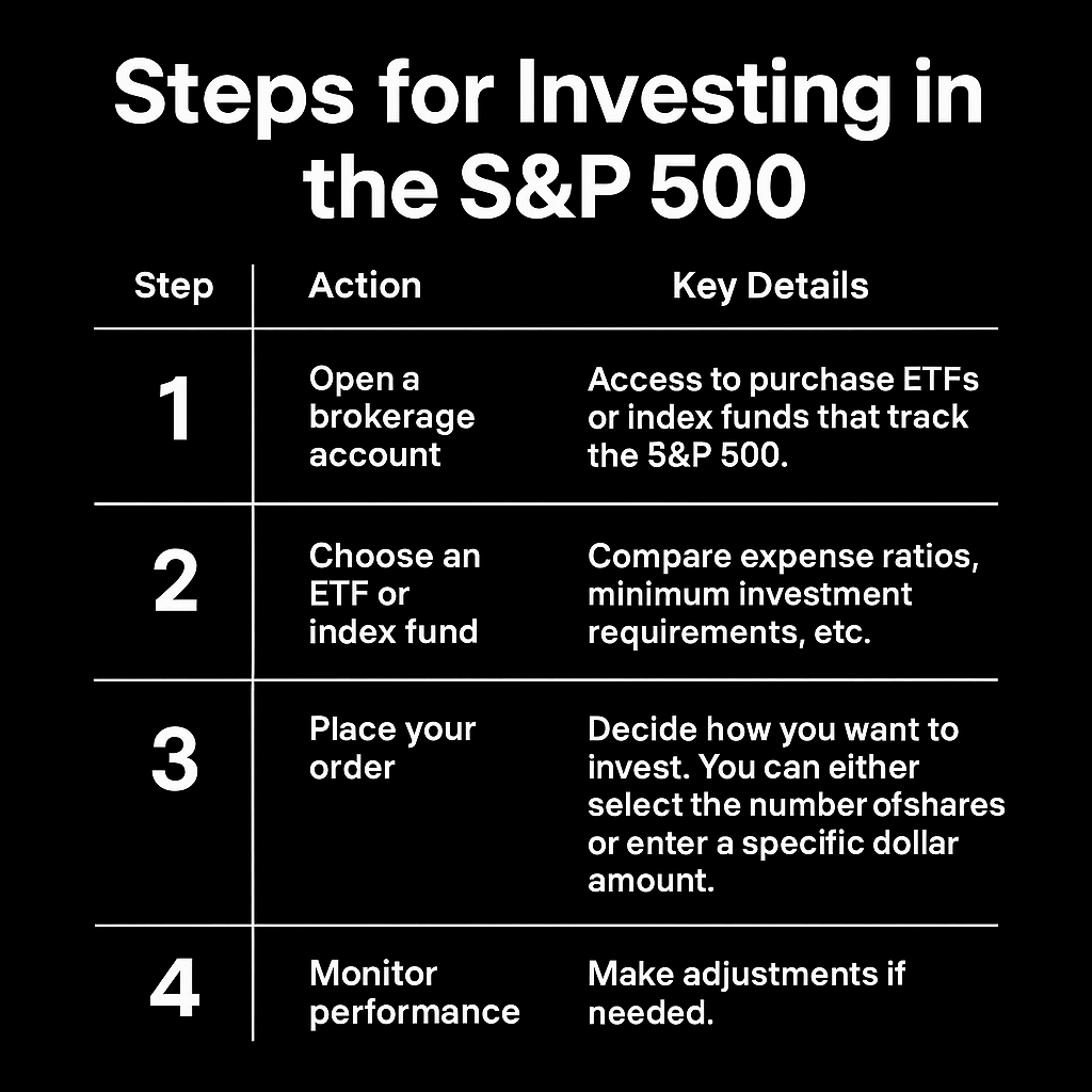 Getting started is straightforward. Open a brokerage account, deposit funds, and choose your preferred S&P 500 fund or ETF. Once purchased, it will sit in your portfolio, automatically adjusting as the index changes.