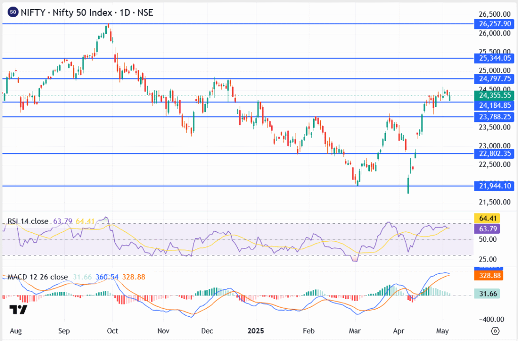 The index may consolidate between 24,200 and 24,800 short term. A breakout above 24,800 could trigger renewed FOMO-led buying toward the psychological 25,000 zone.