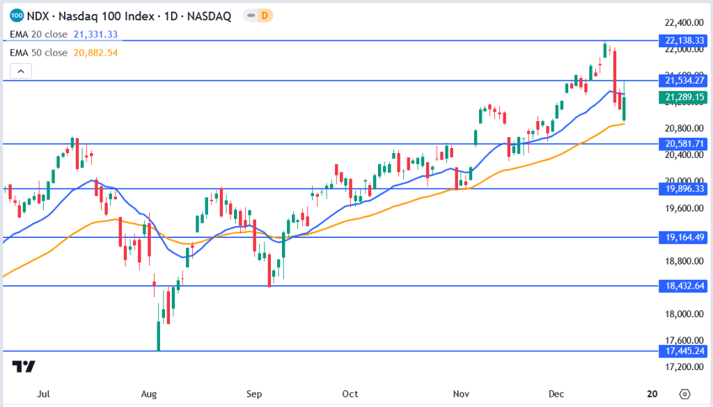 As the Nasdaq 100 steadies, investors should assess whether the index can reclaim 21,534.27 and sustain its upward movement. If it fails to do so, the focus may shift to a retest of the 50-day EMA or possibly deeper declines. Due to reduced holiday trading volumes, volatility may surge, highlighting this as an essential time for positioning for 2025.