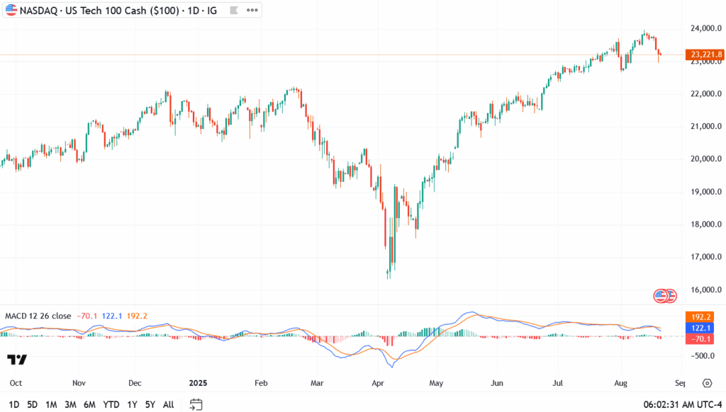 For bears, patience is the play. A sustained break below 23,200 in today’s session would flip the bias, inviting momentum sellers to press for 23,000 and, if pressure builds, 22,500. That zone lines up with the broader August breakout, meaning a failure there risks turning a routine pullback into a trend test. Traders don’t need to chase every tick here, the chart is about to show whether this is just digestion, or the start of something heavier.