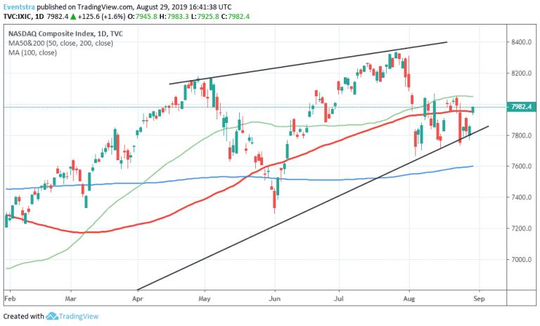 Nasdaq started sharply higher today adding 1.49% at 7,973 after China said it is not interested in escalating trade tensions, hinting that it may not retaliate with tariffs. The Dow Jones Industrial Average is 1.22% higher at 26,353, while the S&P 500 trading 1.21% higher at 2,923.72. The number of Americans filing for unemployment benefits increased as expected last week. The Initial Jobless Claims came in at 215K matching forecasts for August 23, the Continuing Jobless Claims came in at 1.698M, topping forecast of 1.68M in August 16. United States Gross Domestic Product Annualized came in at 2% in line with expectations for 2Q, 2019. The US Pending Home Sales (month over month) came in at -2.5%, below forecasts of 0% in July.