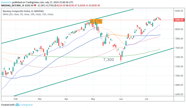 Nasdaq trading above all the key daily moving averages and the bulls are ruling the game for the short term while for the midterm is on a rising trend channel. On the upside immediate resistance is at the weekly and yearly high at 8,260. On the downside Nasdaq first support stands at 8,097 the 20 day moving average while extra bids will emerge at 7,879 the 50 day moving average. Traders will keep their long stock position as far the index is trading above the 8,000 mark.