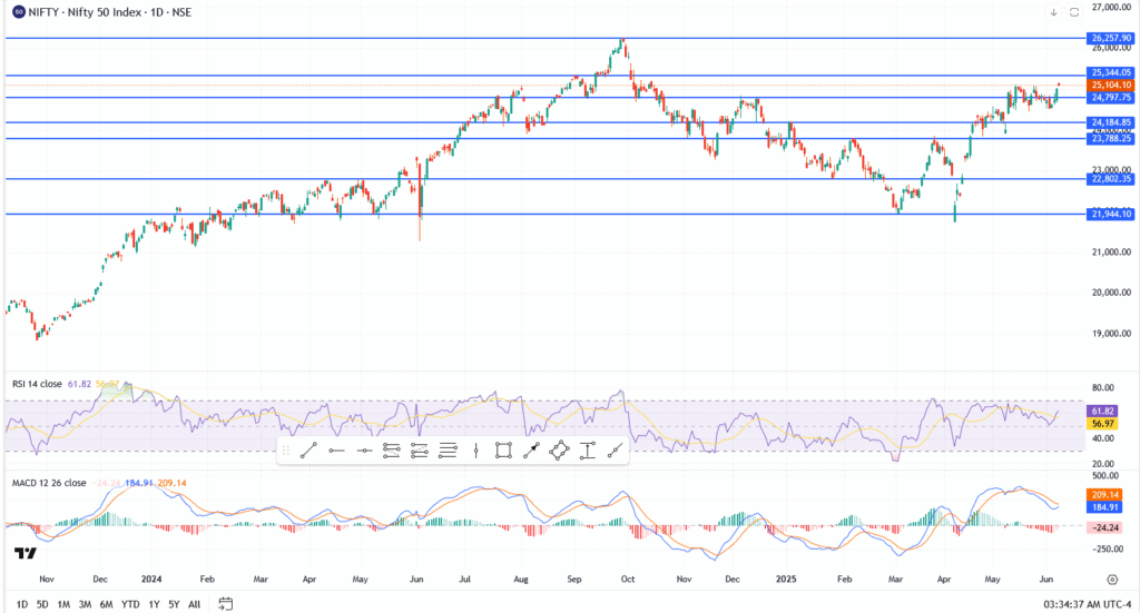 As of mid-morning, the benchmark is trading near 25,104, holding firm despite global caution around rates and currency volatility. Domestic flows remain solid, and traders are largely focused on the technical breakout zone that’s been building pressure since late May.