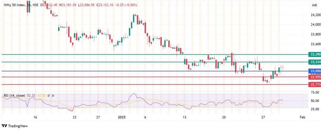 Nifty 50 Index pivots at 23,050 points and the upside will prevail if action stays above that level. Immediate resistance is likely to be at 23,234 points. However, a stronger momentum will break above that level and potentially test 23,390.