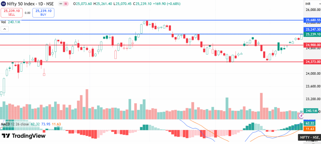 - The Nifty 50 has gained 0.51%, currently trading around 25,239, near its June high of 25,266.