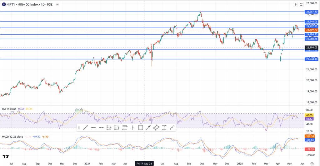 From a technical perspective, the day’s move wasn’t just noise, it was a rejection. Nifty tried to hold ground above 24,797, but sellers showed up right on cue.