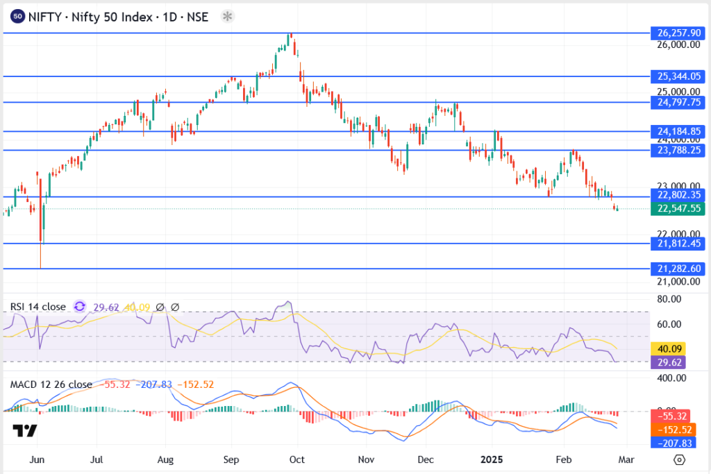 The next trading session will be crucial for Nifty. If the index holds 22,500, a bounce toward 22,800 is possible. However, if selling continues, a break below 21,800 could trigger sharper losses toward 21,300.