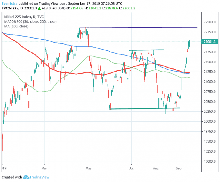 - The Nikkei continues north for ninth consecutive trading session, making higher highs and higher lows, enhancing the recent bullish momentum and