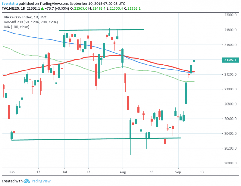 Nikkei 225 finished 0.35% higher at 21,392 after Japan Money Supply M2+CD (year over year) came in at 2.4% in August. Japan Machine Tool Orders (YoY) down to -37.1% in August from previous -33%.