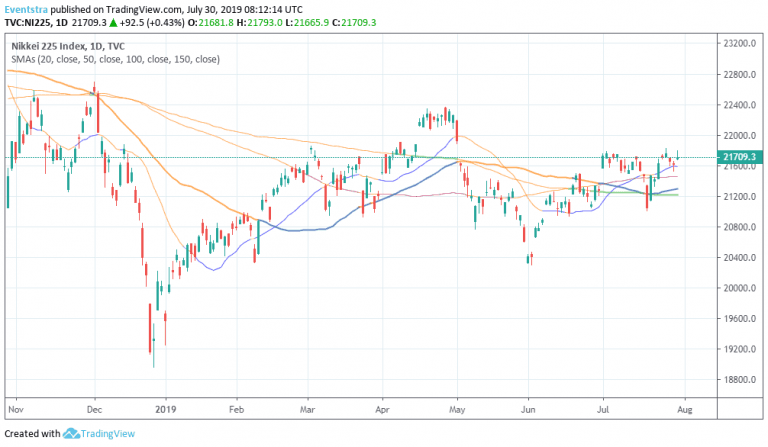 The positive momentum for Nikkei 225 is still intact as the index holds above all the major daily averages. First support for the index stands at 21,590 the 20 day moving average, while another barrier is at 21,291 the 50 day moving average. On the upside resistance stands at 21,807 the high from July 25th.