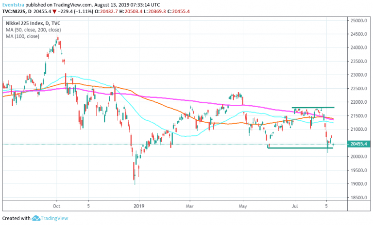Nikkei 225 and Asian indices finished lower mirroring Wall Street indices as investors worries increase over the escalation in Hong Kong unrest and the US – China trade tensions. The USDCNH fixed at 7.0326 above the 7 critical mark. The Hang Seng finished 1.91 percent lower at 25,333, the Singapore Straits Times index finished 0.86 percent lower at 3,141 and the Shanghai composite ended 0,63 percent lower to 2,797. Aussie stocks also trading lower, the ASX is 0.20% lower at 6,577.