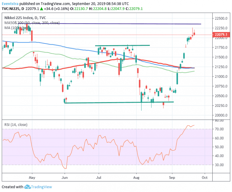 The Nikkei continues north for tenth consecutive trading session, making higher highs and higher lows, as the recent bullish wave now targets the yearly highs. On the upside resistance for the Nikkei 225 stands at 22,204 today’s high, a break above, perhaps will set the stage for a move up to yearly highs. The index have reached overbought levels as indicated by the RSI index so a correction can’t be ruled out. On the downside immediate support stands at 22,047, today’s low and then at 21,219 the 100-day moving average. A break below that level might accelerate the selloff down to 21,138 and the 200-day moving average.