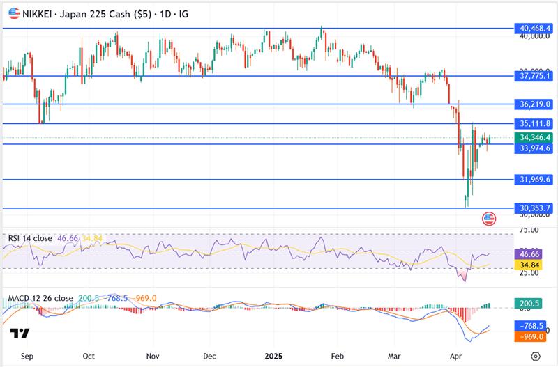 The Nikkei 225 index hovered near the flatline in Thursday’s session, holding just under the 34,350 resistance zone as investors remained hesitant to chase the rebound. After bouncing sharply off last week’s lows, Japan’s benchmark is now losing steam, with traders bracing for potential downside.